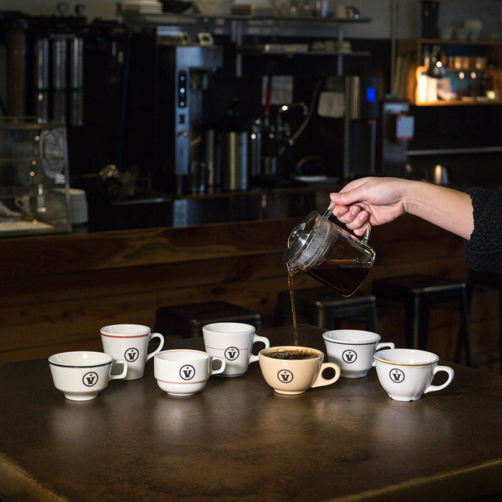 We find cute, old-stock mugs and our friends at Bean & Bailey Ceramics bake a Velo logo right on the side. Styles and colors vary, so "You get what you get and you don't pitch a fit" as your first grade teacher once said.