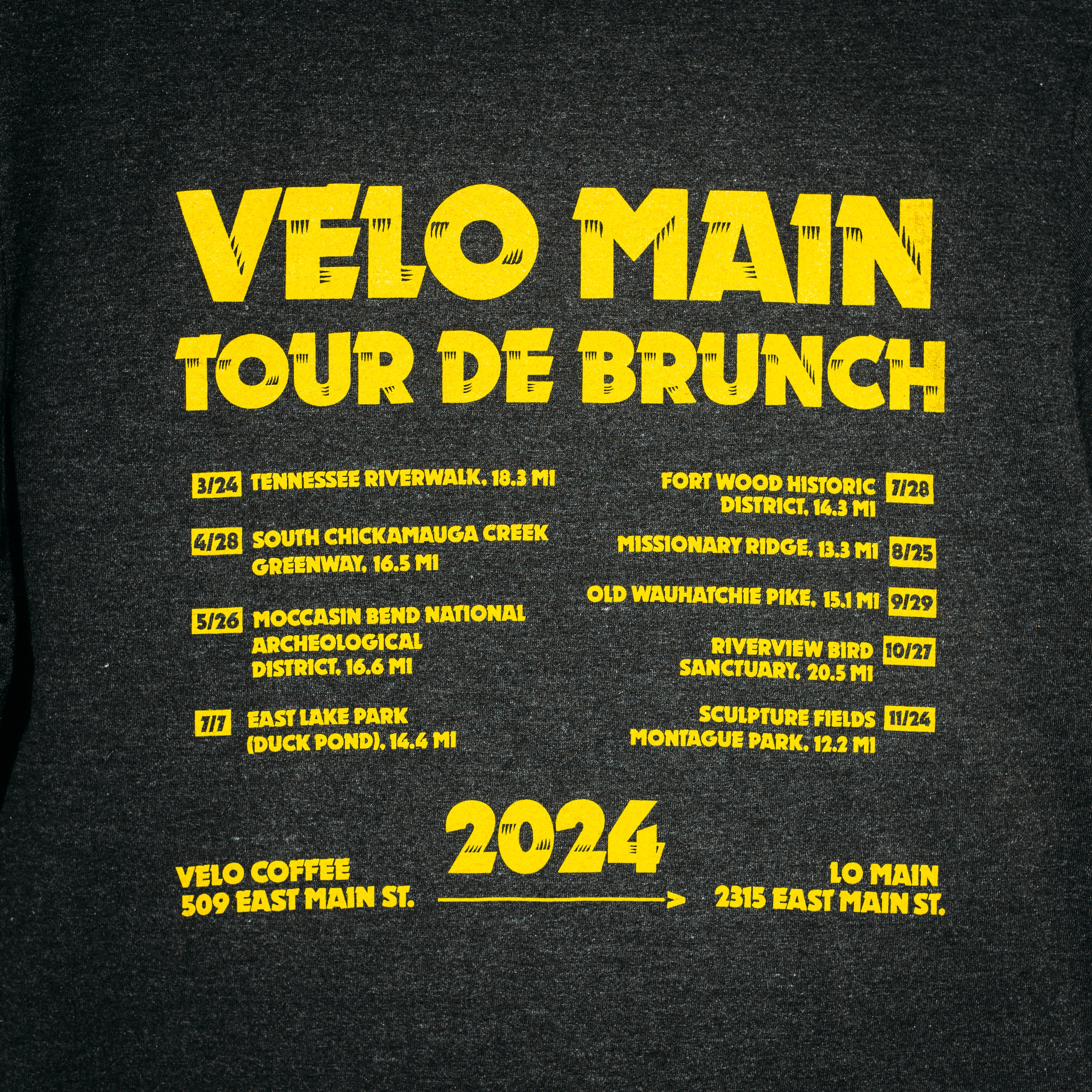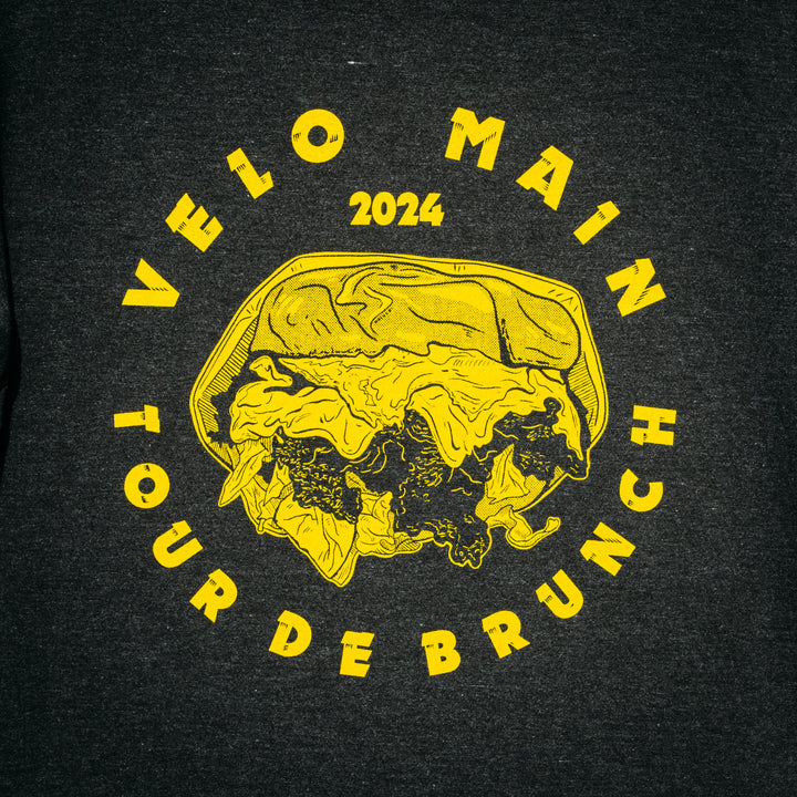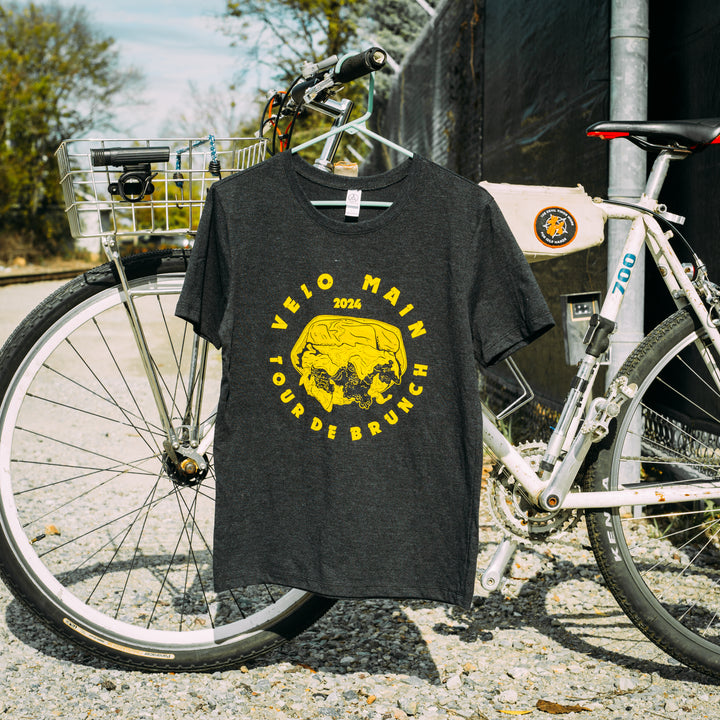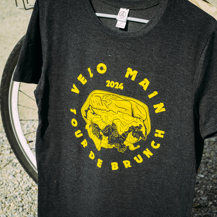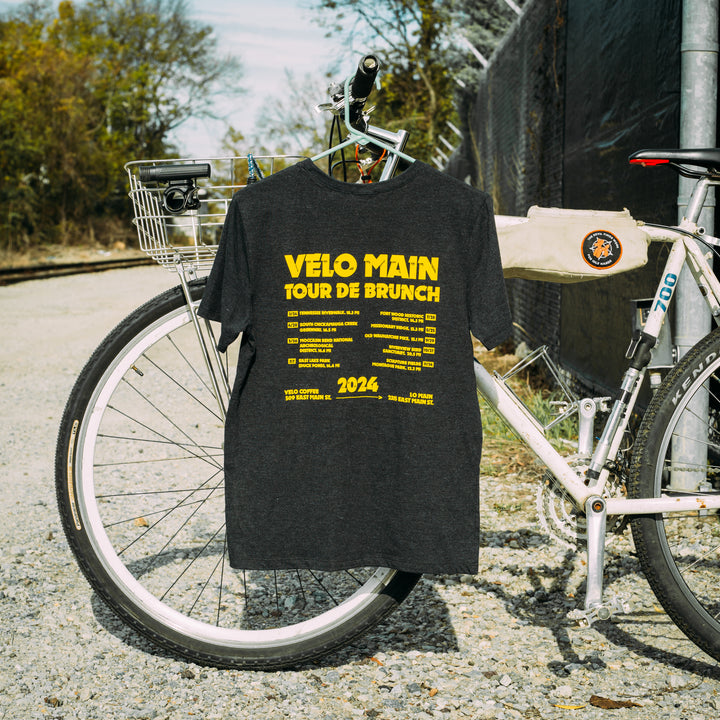 We're celebrating the 2024 VELO MAIN Tour De Brunch with an exclusive "tour tee", and we have a few mediums and largest leftover from the pre-sale! Get yours now.